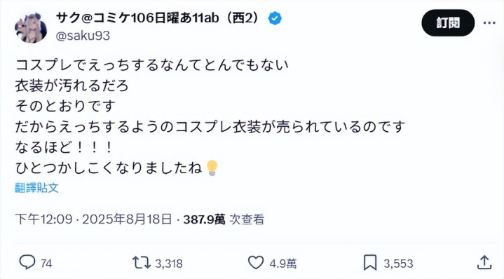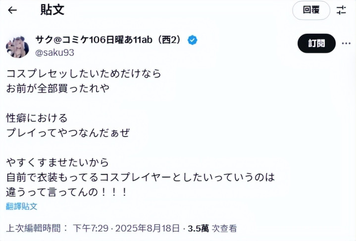 最近,日本知名Coser サク(@saku93)在X(原推特)上发的一条动态,把整个ACG圈直接点燃。